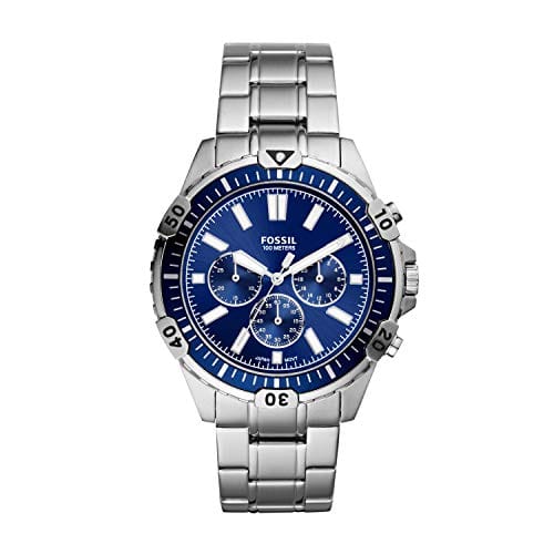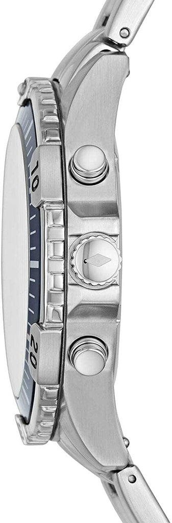 Fossil FS-5623 Metal Band Men Watch. The case is made out of silver stainless steel with a blue bezel, which stands for the high quality of the item, it has a blue color dial. This model has got 100 meters of water resistance. it can be worn in scenarios where it is likely to be splashed but not immersed in water and will be fine in rain. The watch is shipped with an original box and a guarantee from the manufacturer.
