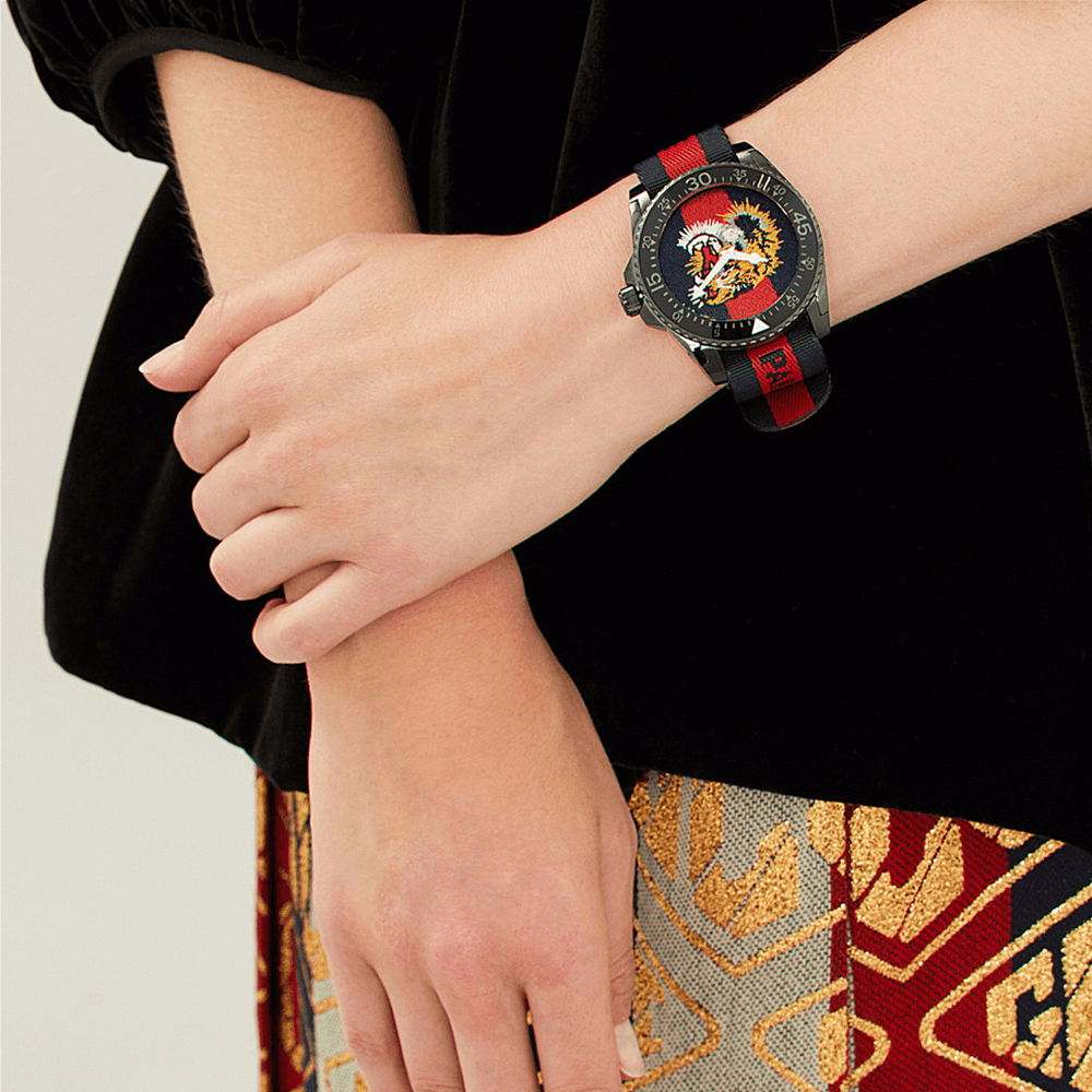 Solid case back. Round case shape. Case size: 45 mm. Case thickness: 8 mm. Band width: 24 mm. Tang clasp. Water resistant at 200 meters / 660 feet. Functions: hour, minute. Casual watch style. Gucci Dive Tiger Embroidered Dial Men's Watch YA136215.