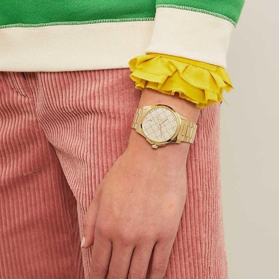 Today, Gucci manufactures handbags, luggage, shoes, jewelry, sunglasses, wallets, belts, scarves, ties, hats, writing instruments, and of course, the most fashionable of timepieces.