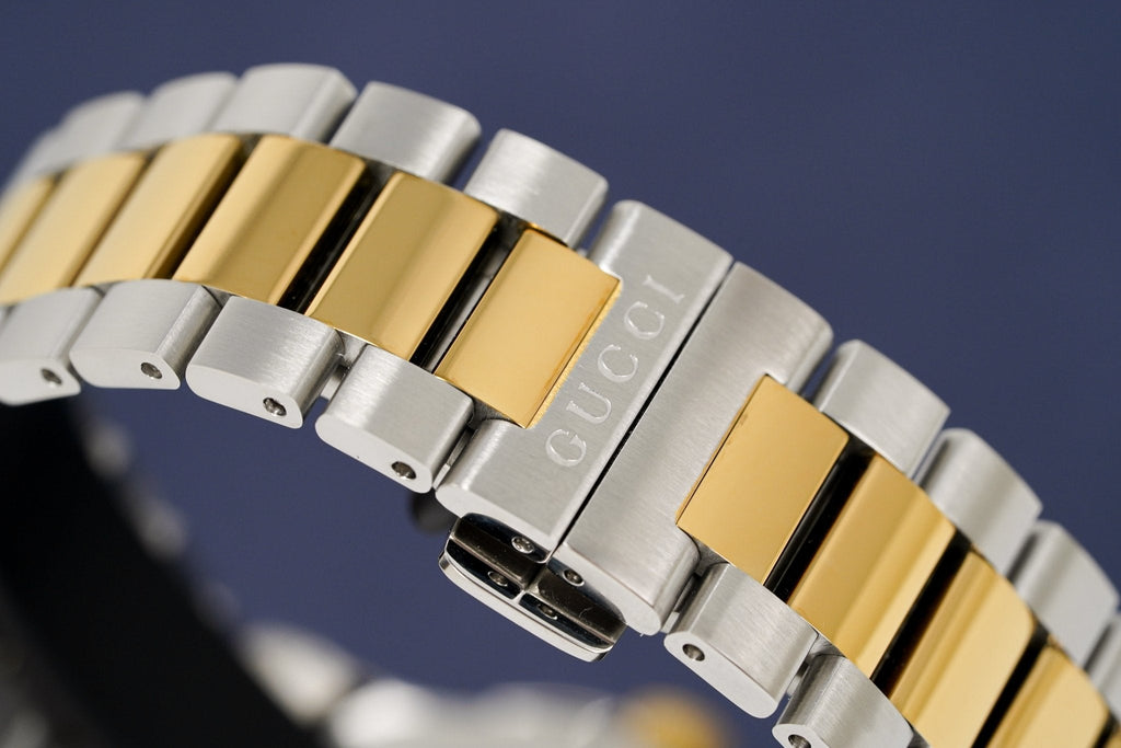 Fixed bezel. Scratch Resistant Sapphire crystal. Solid caseback. Deployment clasp. Pull / Push crown. Case size 38 mm x 9 mm. Band 20 mm x long. Gucci YA126474 G-Timeless Watch.