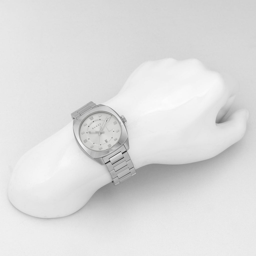 Solid case back. Case size: 41 mm. Case thickness: 8 mm. Cushion case shape. Band width: 23 mm. Deployment with push button release clasp. Water resistant at 50 meters / 165 feet. Functions: date, hour, minute, second. Casual watch style. Watch label: Swiss Made. Gucci GG2570 Silver Dial Men's Watch YA142308.