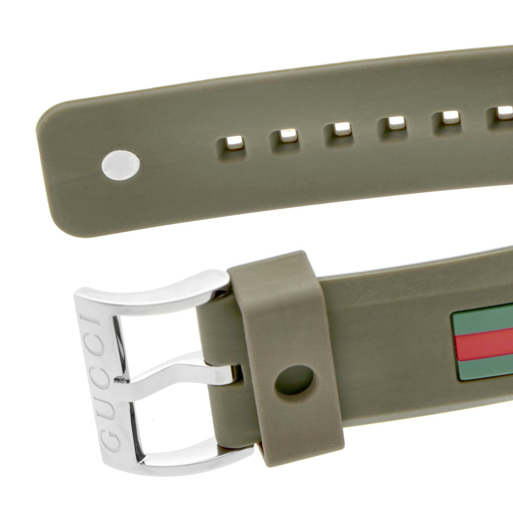 - Stainless steel watch featuring sunray dial with interlocking "G" logo and khaki rubber band with center signature web stripe