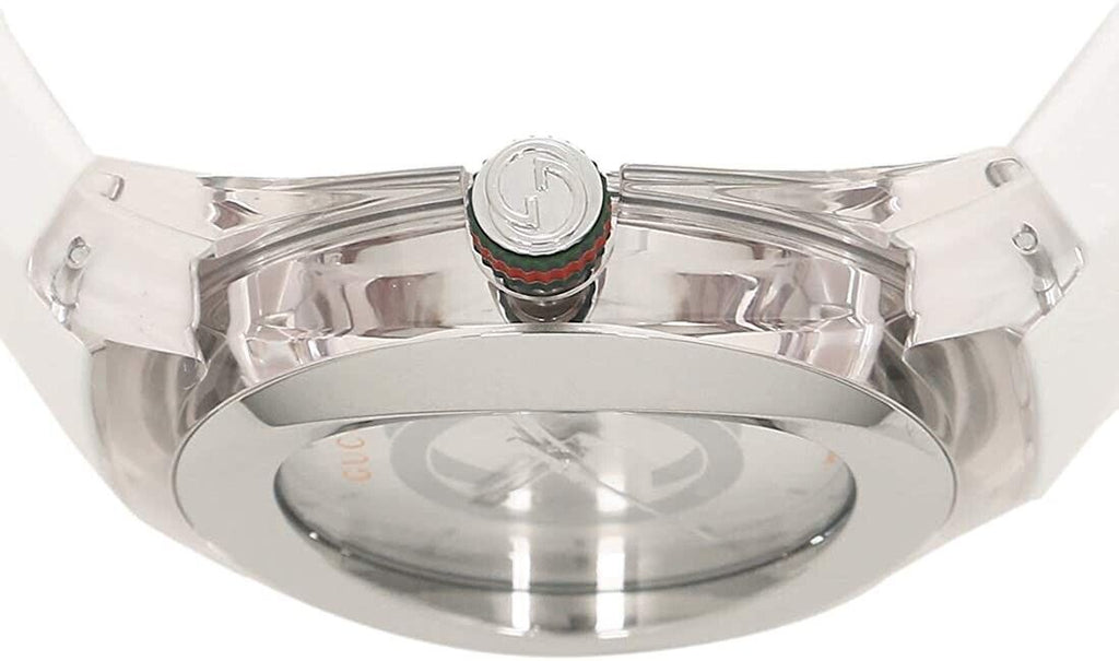 This strikingly handsome Gucci Sync watch is uniquely designed for both the modern man and woman who favors reliable and durable functionality. The watch features a 46mm stainless steel and transparent white nylon case with a rubber strap for a smart and sporty look.