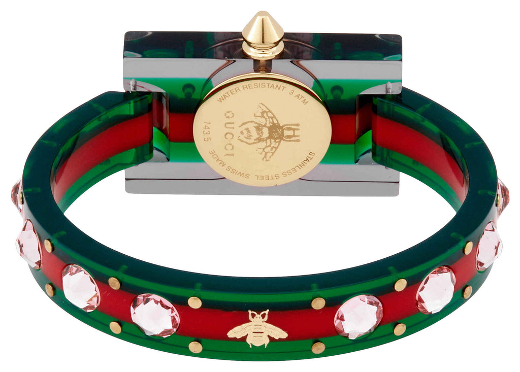Transparent resin case with a green and red striped resin bracelet with pink crystal studs. Fixed gold-tone stainless steel bezel. Pink mother of pearl dial with gold-tone hands. No markers. Dial Type: Analog. Quartz movement. Scratch resistant sapphire crystal. Pull / push crown. Solid case back. Round case shape. Case dimensions: 24 mm x 40 mm. Case thickness: 8 mm. Band width: 11 mm. Water resistant at 30 meters / 100 feet. Functions: hour, minute. Vintage Web Series. Dress watch style. Watch label: Swiss Made. Gucci Vintage Web Pink Mother of Pearl Dial Ladies Watch YA143525.