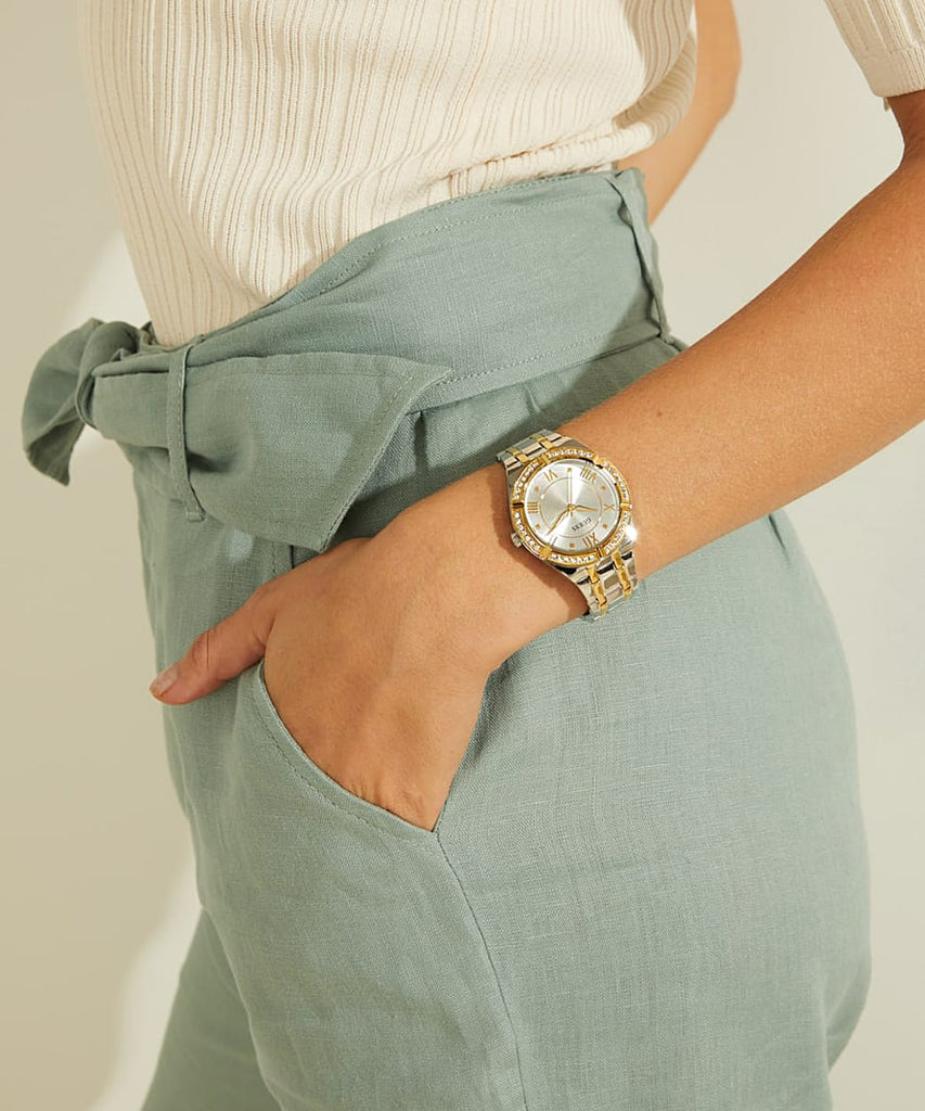 This classic analog timepiece gets a glam update with a two-tone design and crystal encrusted case. Silver and gold-tone polished steel bracelet.