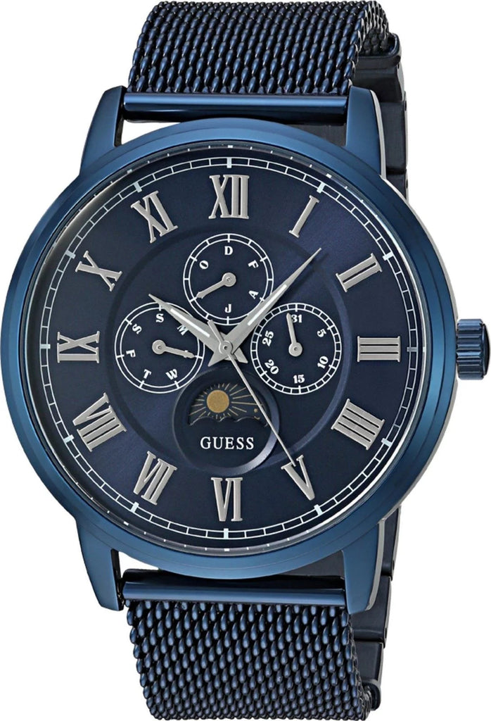 This Guess Blue Dial Stainless Steel Mesh Men's Watch W0871G3 comes in stainless steel case with stainless steel bracelet. Fixed bezel. Blue Dial with Silver-tone hands and index hour markers. Minute markers around the outer rim. Dial Type: Analog. Quartz movement. Scratch resistant. Solid case back. Round case shape. Water resistant. Functions: chronograph, hour, minute, Second.