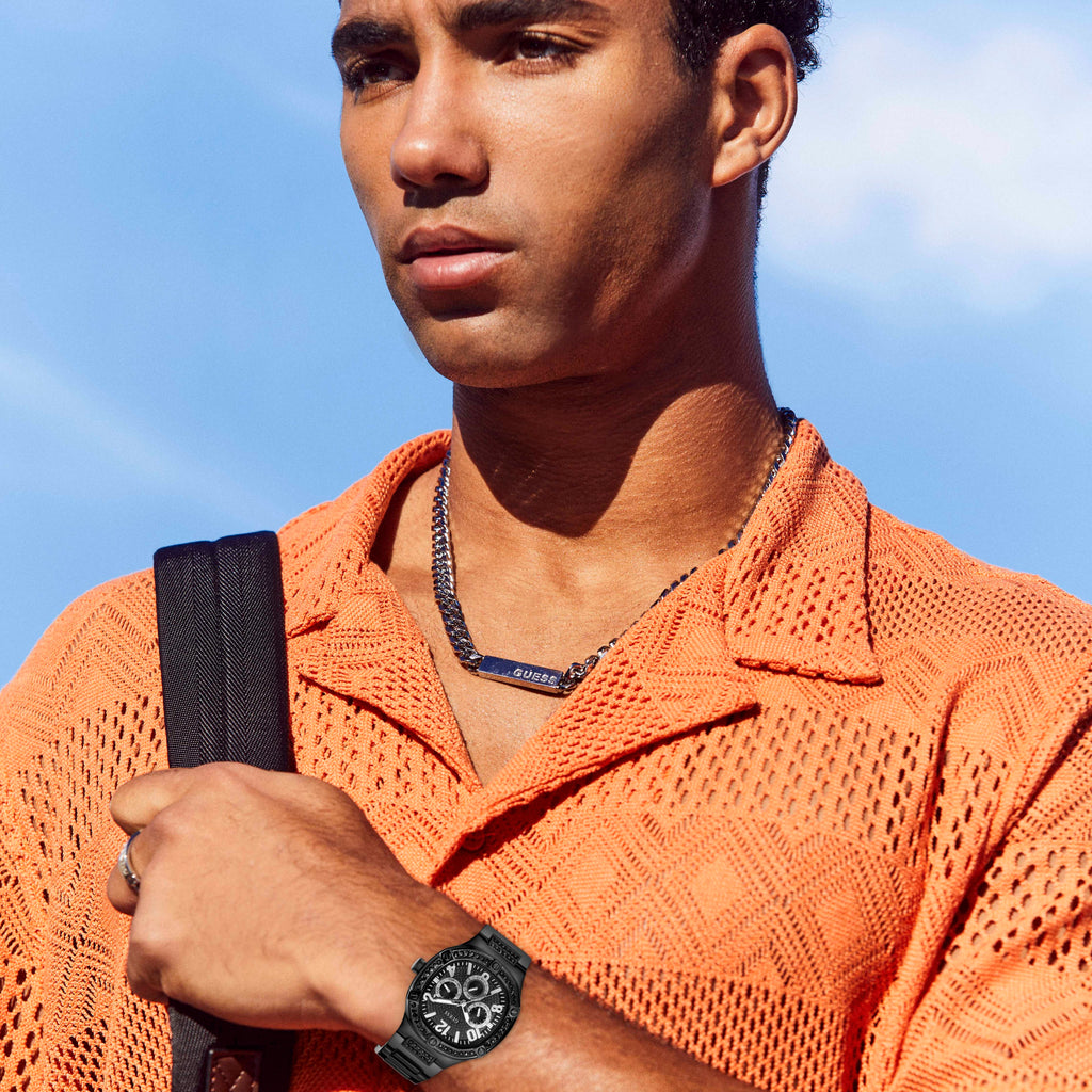 Elevate your style with the Guess Duke watch. Featuring a sleek black steel strap and glimmering crystals on the black dial, this watch exudes confidence and sophistication. Perfect for any occasion, it's a statement piece that will turn heads and make you stand out from the crowd. Stay on time and on trend with Guess Duke.