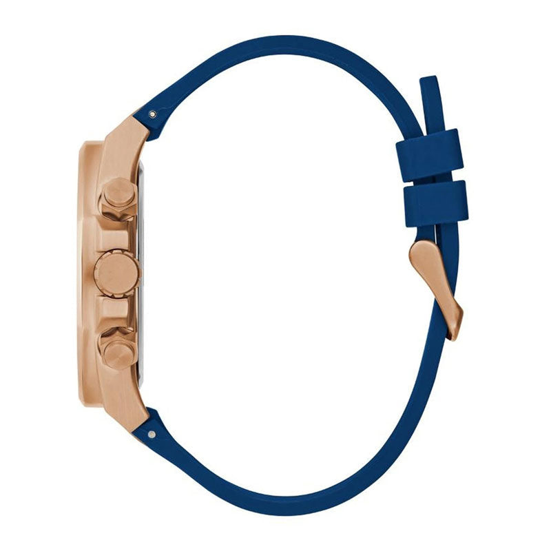 The silicon strap vaunts a blue hue that enhances the look of the watch. Moreover, it is fitted with a buckle clasp to ensure a secure fit on the wrist.