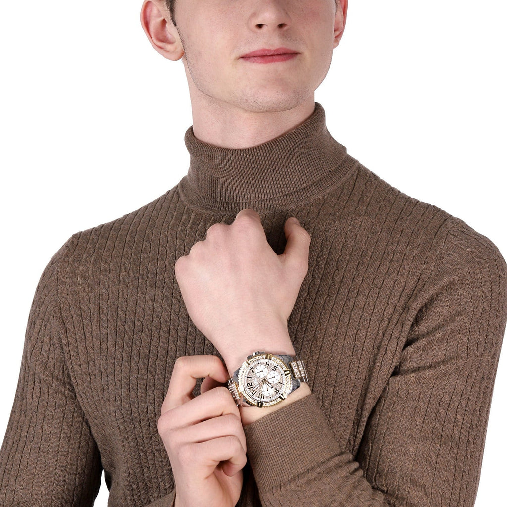 Elevate your style with the Guess Frontier Chronograph Watch. This impressive timepiece features a silver dial adorned with sparkling crystals, complemented by a two tone steel strap. With its precise chronograph movement, this watch is perfect for busy, fashion-forward men. Own your time and make a statement with the W0799G4.