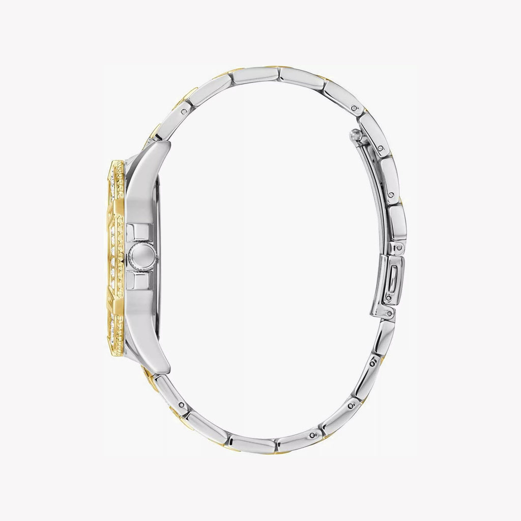 The Guess Frontier W0799G4 watch is coated in white crystals and coloured in two-tone gold and silver. This glamourous timepiece will make a strong statement anytime it's worn, also featuring a multifunction movement. These extra subdials make timekeeping as convenient as possible, and complete the luxury look.