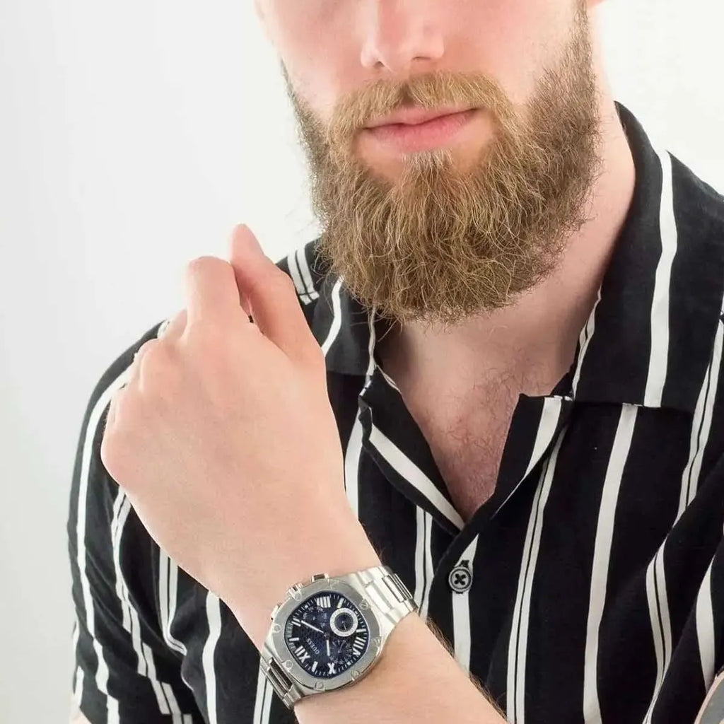 This headliner is sure to steal the show, it has a unique rounded square case design with screw details and a textured multi-function dial with ombre effect and a brushed and polished bracelet.