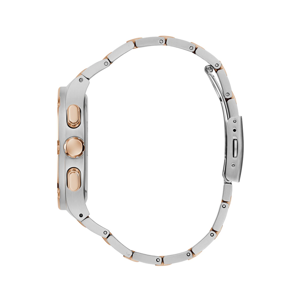 Best for the modern individual who appreciates both style and functionality, this Guess watch is perfect for those who want to make a statement. The brushed silver-tone case with a brushed rose gold-tone bezel exudes sophistication, while the sunray gradient blue multifunction dial adds visual interest. Completed with a brushed and polished silver and rose gold two-tone bracelet, this timepiece effortlessly elevates any outfit.
