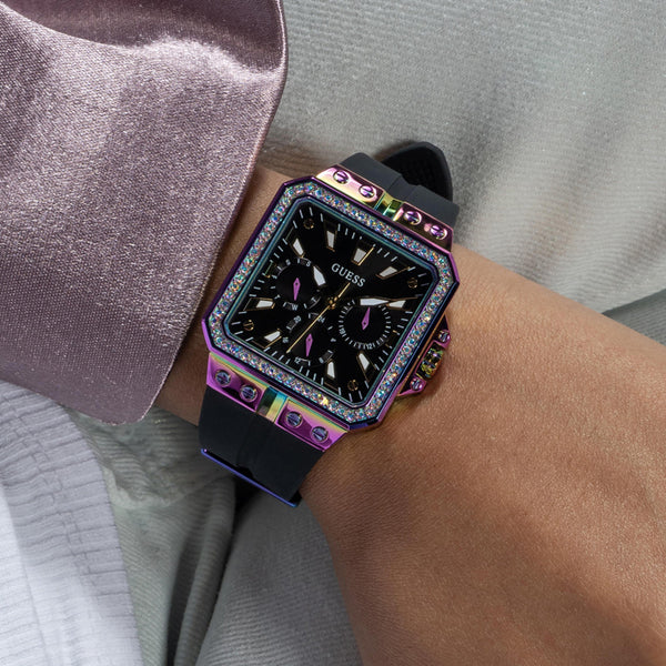 Designed for comfort and durability, the watch comes with a soft black silicone strap that provides a secure and flexible fit. The stainless steel case ensures longevity, while the quartz movement guarantees precise and reliable timekeeping. With its water-resistant design, this Guess watch is built to handle everyday wear while maintaining its stylish appeal.