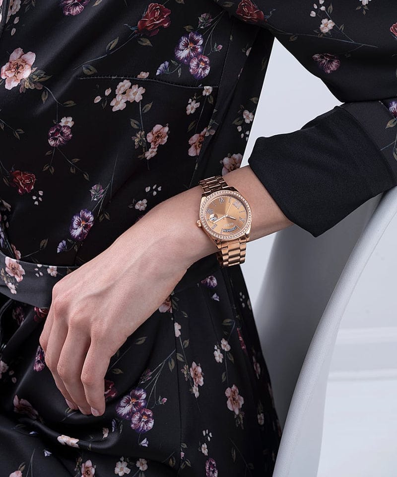 This fully embellished crystal bezel, Sunray dial watch is integrated with a polished 3-link stainless steel bracelet. This classic timepiece also features a day of the week window at the 12 o’clock hour with a bubble date at the 3 o’clock hour.