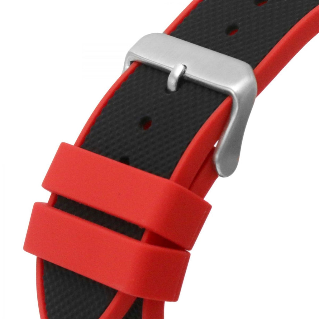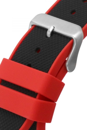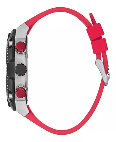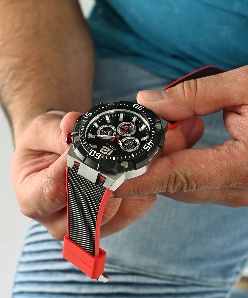 Navigate wherever life takes you in this oversized aggressive new sport look. This 50 mm case features 4 screw details on the bezel and a chrono-look multi-function movement with cut-thru sub dials on a carbon fiber-like dial and a signature FLEX strap of a textured upper silicone with a smooth backed silicone for a two tone look.