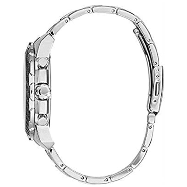 Combining classic structure with sport functionality, the sleek silhouette of this timepiece is stunning with its stainless steel case, black dial and silver-tone accents.