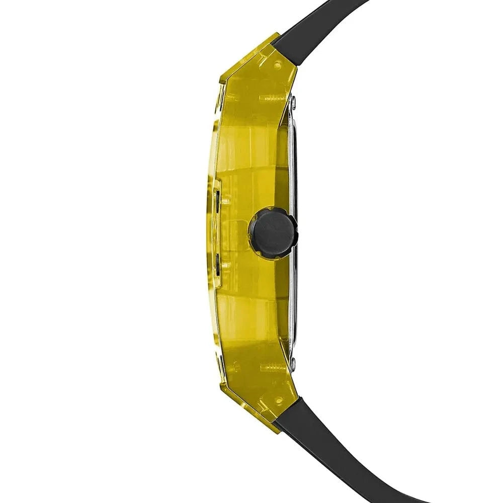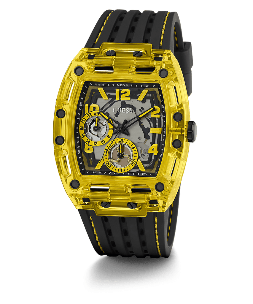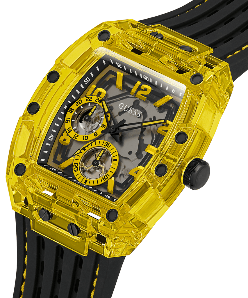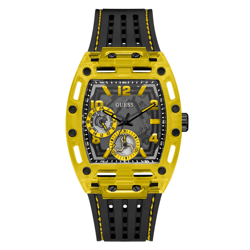 Skeleton dial details keep this phoenix on the rise. This style features a polycarbonate cut-thru barrel shaped case with black screw details and a cut-thru multi-function dial paired with a silicone strap with contrast stitching.
