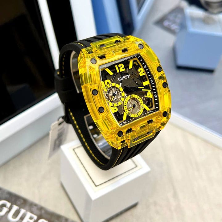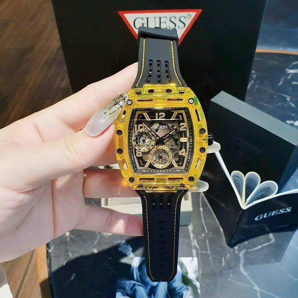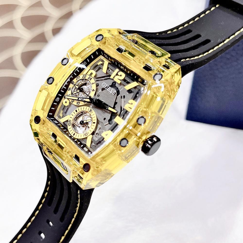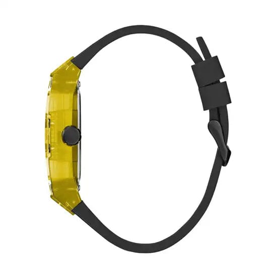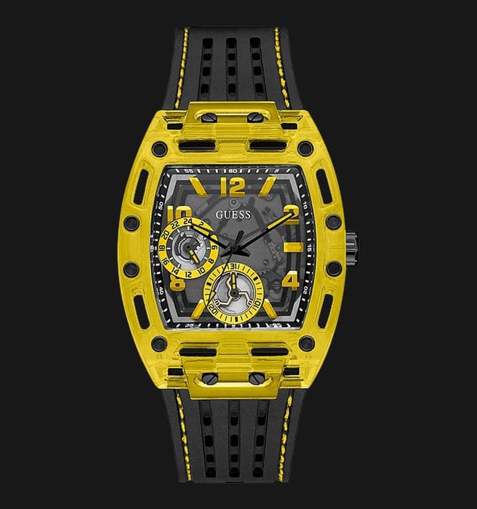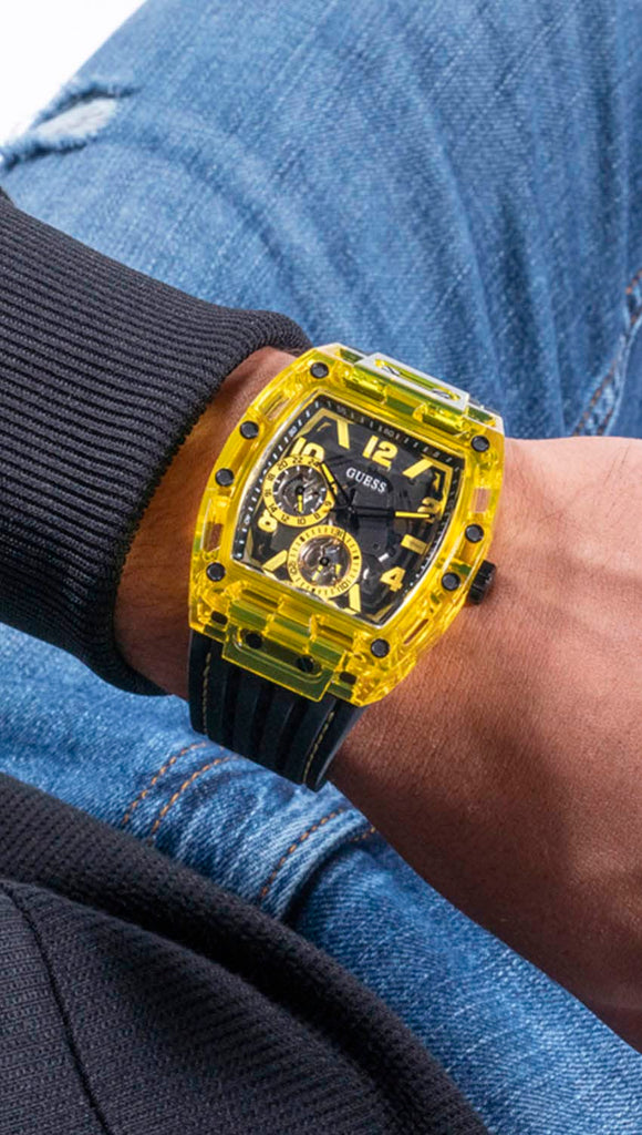 Skeleton dial details keep this phoenix on the rise. This style features a polycarbonate cut-thru barrel shaped case with black screw details and a cut-thru multi-function dial paired with a silicone strap with contrast stitching.