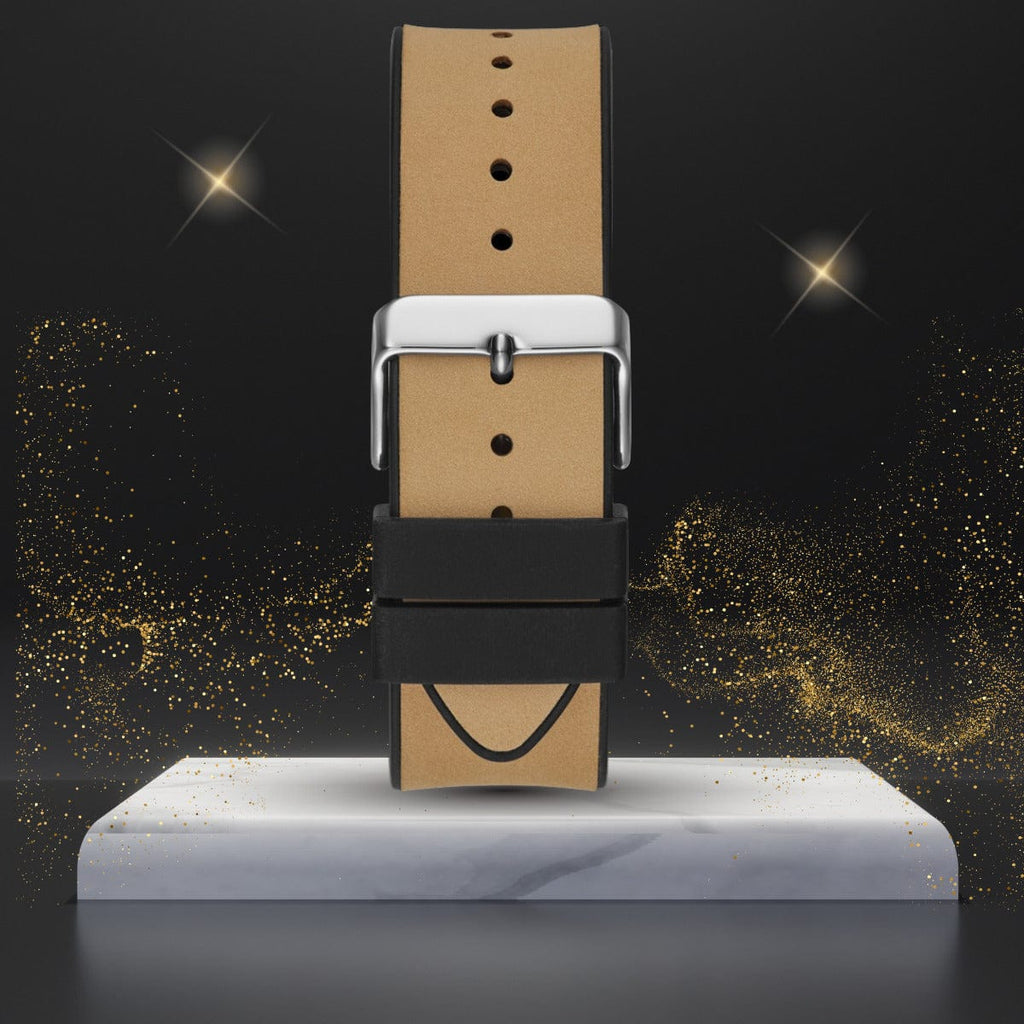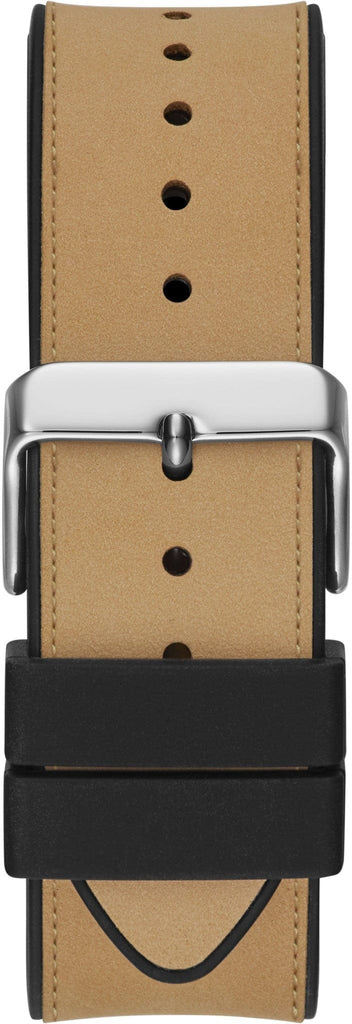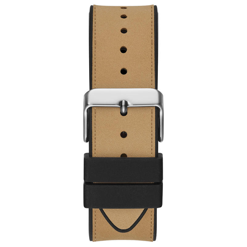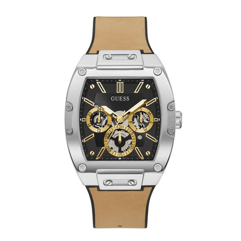 Skeleton dial details keep this phoenix on the rise. Featuring a silver-tone barrel shaped case with a black multi-function dial, this also features a FLEX strap. A soft black silicone paired with smooth beige leather and match beige stitching to create a flexible fit for every wrist.