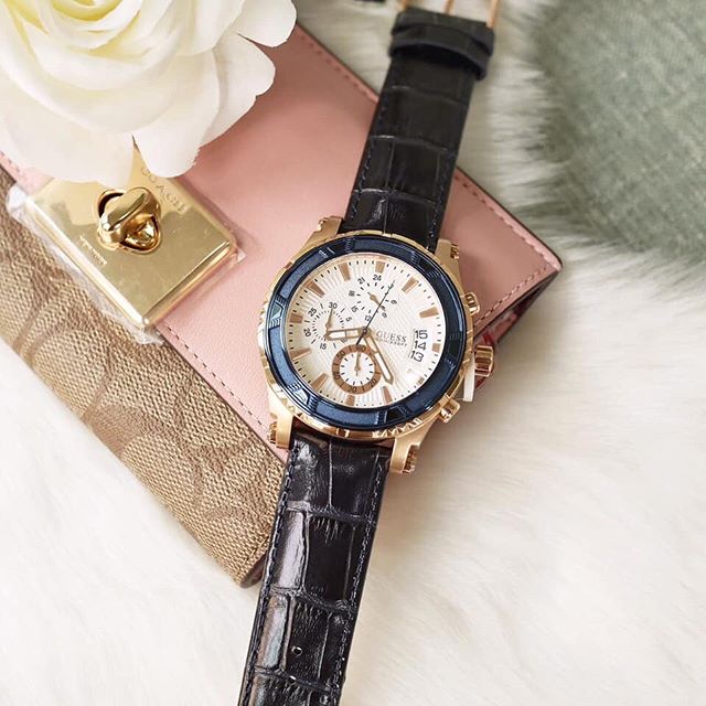This gents Guess watch, features a gold polished case with a white sunray multi-function dial and a black leather bracelet. This watch is also powered by a quartz movement.