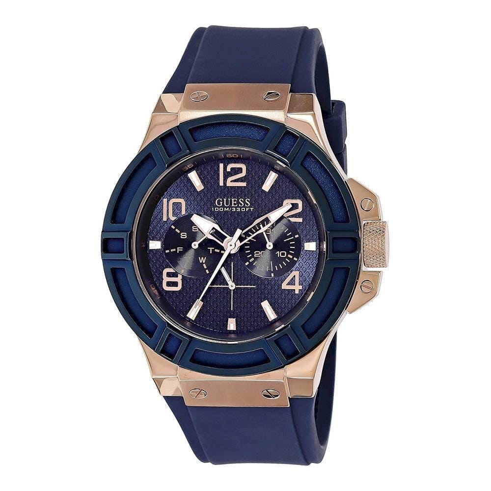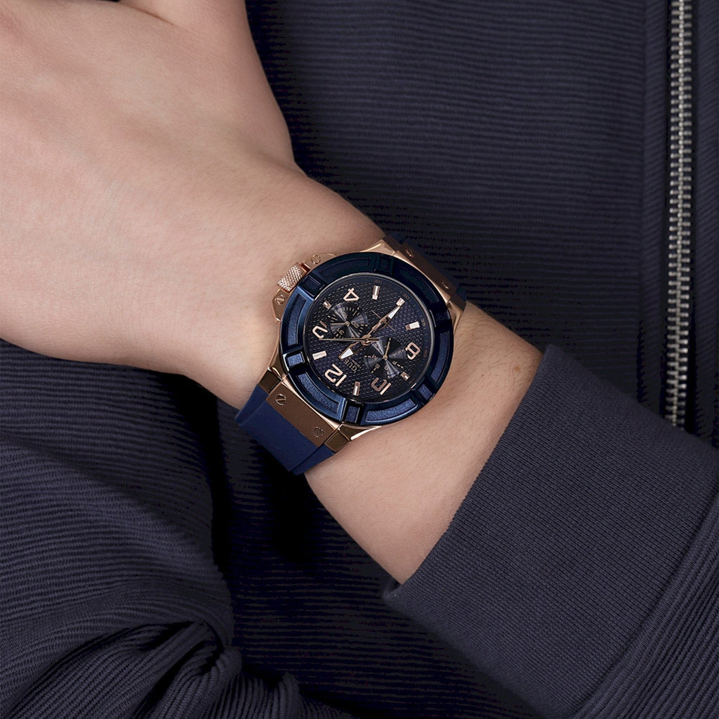 A blue smooth Silicone Strap strap GUESS watch featuring a brushed and polished rose gold case with a blue top ring and a blue multifunctional sunray dial.