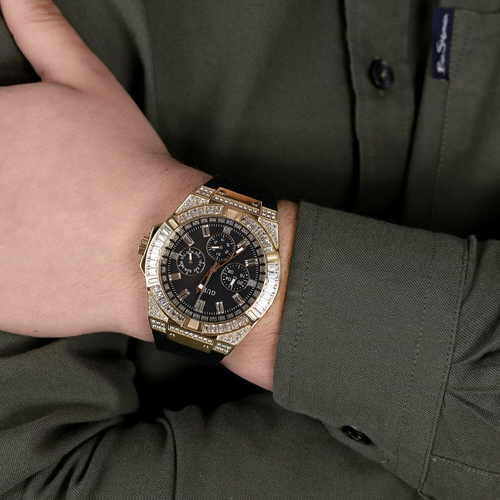 Elevate your style with the Guess Zeus Chronograph Diamonds Black watch for men. The sleek black dial, black silicone strap, and diamond accents add a touch of luxury to any outfit. Stay punctual and stylish with this must-have accessory!