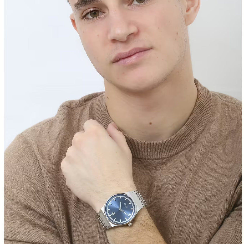 Hugo Boss men's watch. Case made of 316 L stainless steel, round shape, silver colour, diameter 41 mm, blue dial. Analog display. Bracelet made of 316L stainless steel in silver color with push button clasp. Movement: 3 spheres with date. Water resistance: 5 BAR. The reference is 1514076. This only time will be shipped with the original box Hugo Boss if provided by the brand
