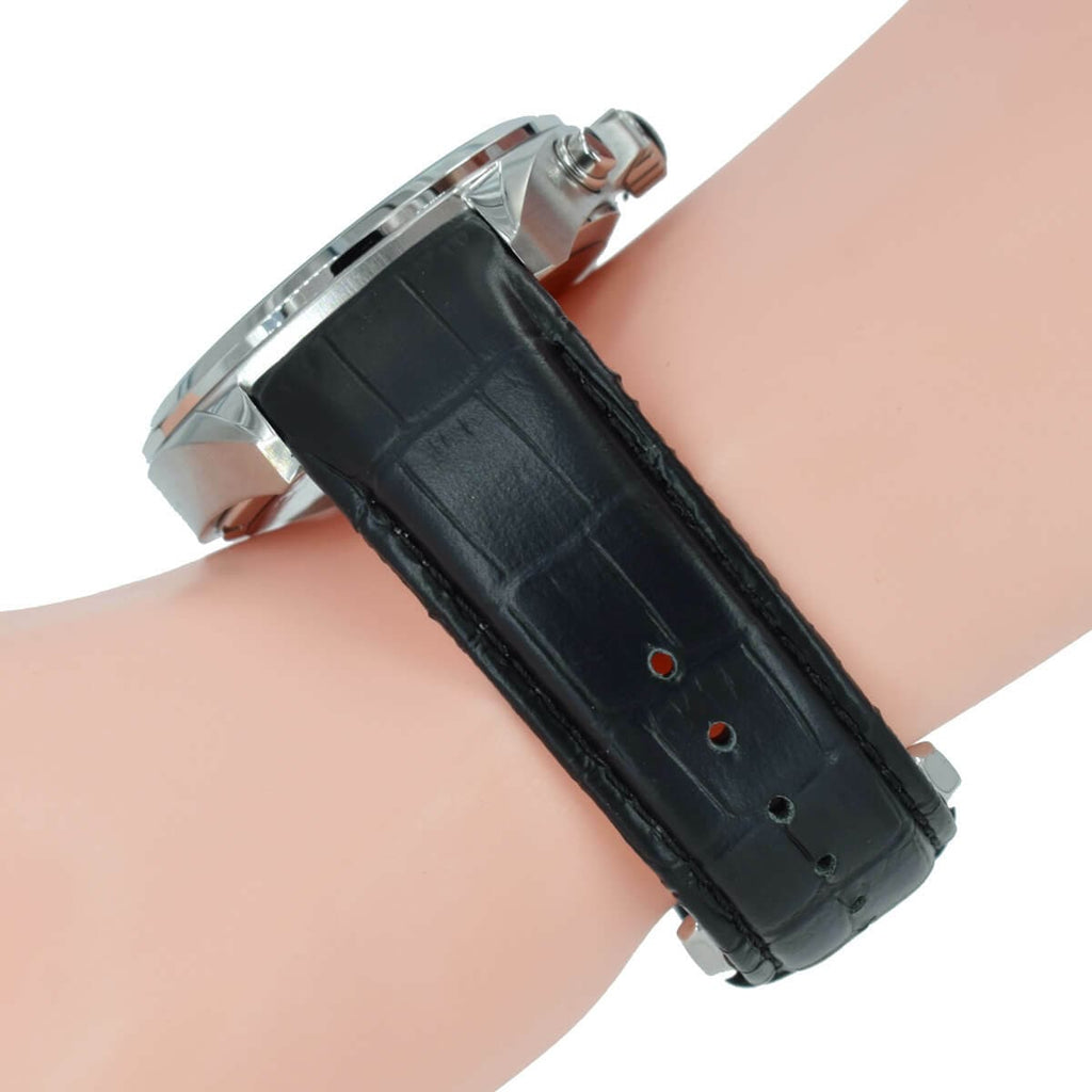 With a crocodile embossed leather strap, this watch by BOSS is also designed with a stainless steel case, blue dial, and chronograph movement.