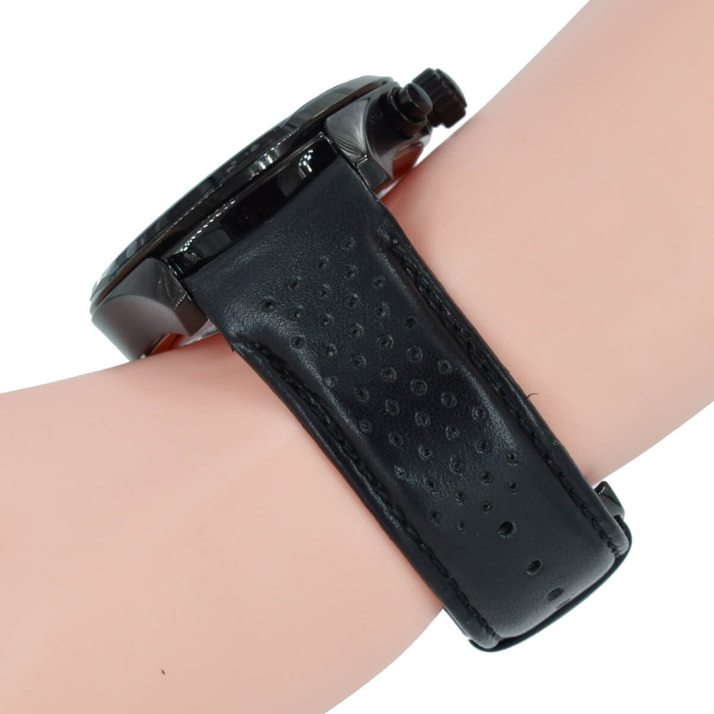 leather Strap. stainless steel case. black stainless steel bezel. black dial with Luminiscent hands and Index hour markers. chronograph. quartz movement. mineral crystal. 44mmx 44mmx 11mm case. 22mm band width. 30 meters water resistant. 1513550