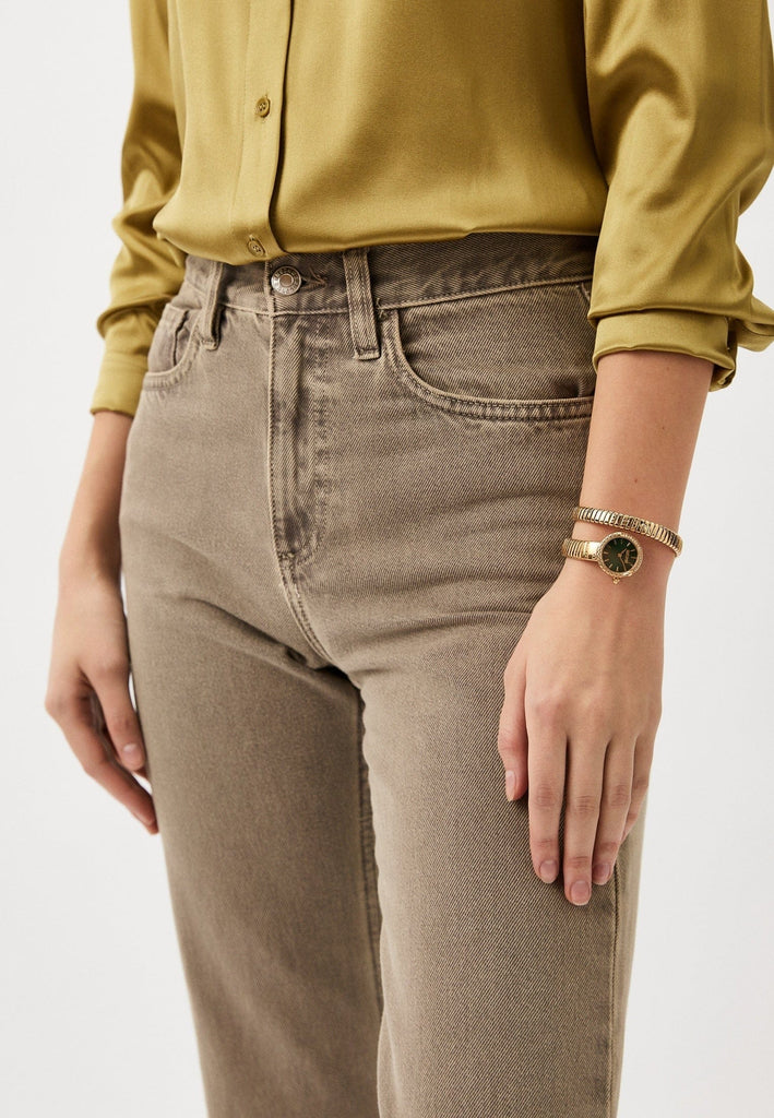 In the realm of fashion, this Just Cavalli Watch emerges as a symbol of elegance and audacity. Crafted in a refined design, its round case and stainless steel band shimmer in a luxurious yellow gold, exuding sophistication. The bottle green dial adds a touch of mystery, perfectly complementing the bold character of the Just Cavalli Signature Snake collection. With water resistance and a mineral crystal, it seamlessly blends style with practicality, making it an exquisite choice for the modern woman.