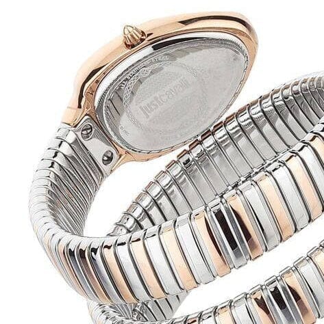 - Silver dial with crystals, 2-hands movement, and Just Cavalli branding logo at 12 o’clock position