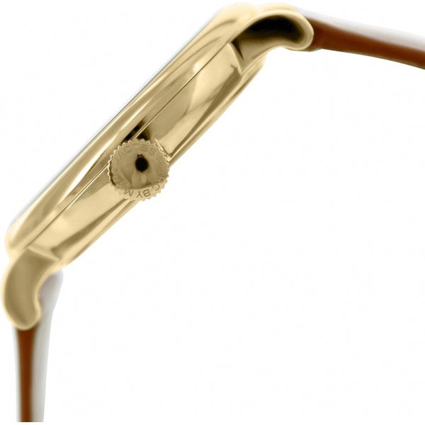 Gold-tone stainless steel case with a tan (pigskin) leather strap. Fixed gold-tone bezel. White dial with gold-tone hands and index hour markers. Dial Type: Analog. Seconds sub-dial at the 6 o’clock position. Quartz movement. Scratch resistant mineral crystal. Pull / push crown. Solid case back. Case diameter: 36.5 mm. Case thickness: 8.2 mm. Round case shape. Band width: 18 mm. Tang clasp. Water resistant at 50 meters / 165 feet. Functions: hour, minute, second. Casual watch style. Marc by Marc Jacobs Baker White Dial Leather Ladies Watch MBM1316.