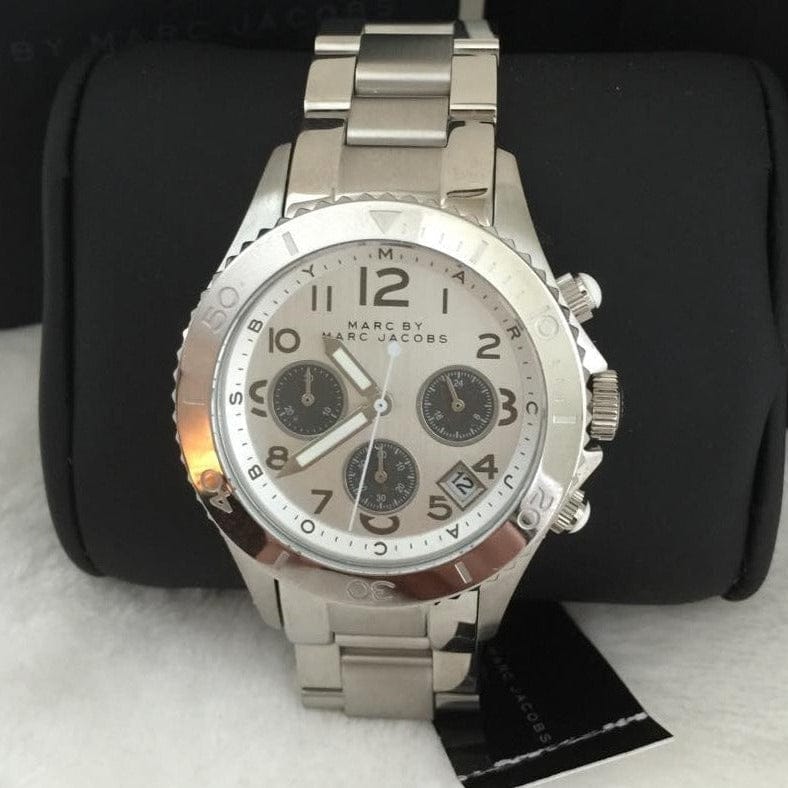Elevate your style with the Marc Jacobs Marc Chronograph Silver Dial Watch for Men. Featuring a sleek silver steel strap and a sophisticated chronograph dial, this watch is the perfect balance of function and fashion. Make a statement and never be late again with this must-have accessory!
