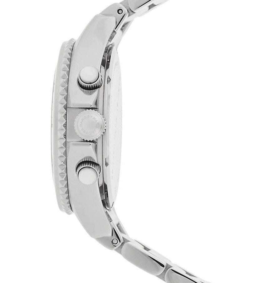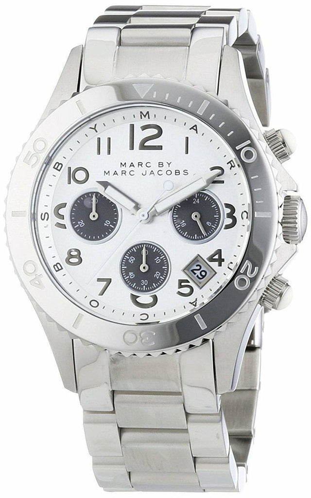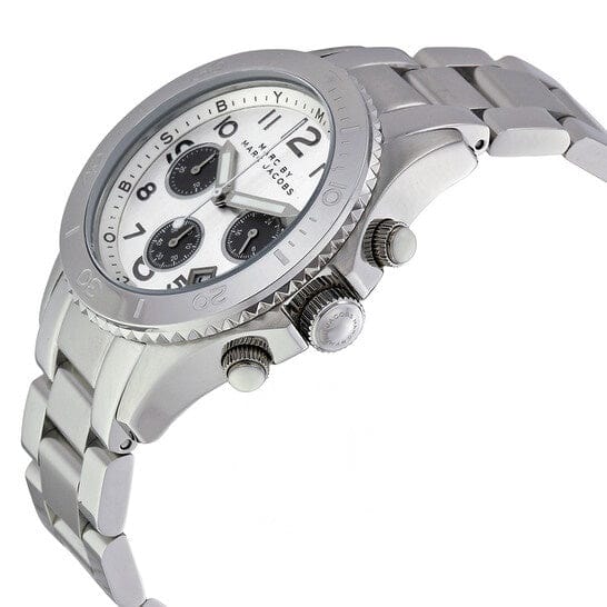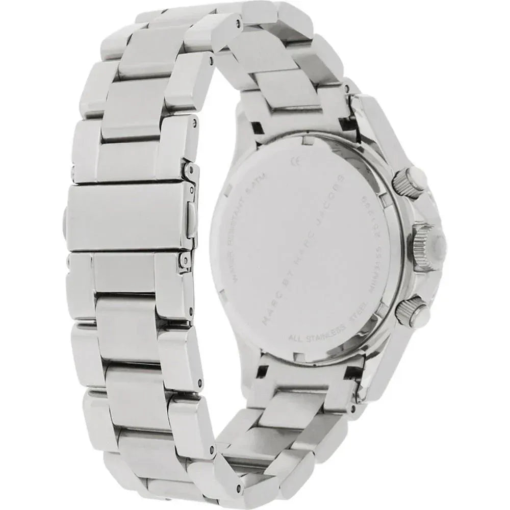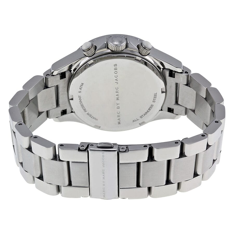 Pull / push crown. Solid case back. Case diameter: 40 mm. Case thickness: 13 mm. Round case shape. Band width: 20 mm. Band length: 7.5 inches. Deployment clasp. Water resistant at 50 meters / 165 feet. Functions: chronograph, date, hour, minute, second. Casual watch style. Marc by Marc Jacobs Rock Chronograph Silver Dial Stainless Steel Unisex Watch MBM3155.