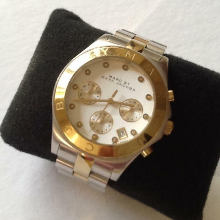 Pull / push crown. Solid case back. Case diameter: 41 mm. Case thickness: 12 mm. Round case shape. Band width: 20 mm. Fold over double push button safety clasp. Water resistant at 50 meters / 165 feet. Casual watch style. Marc by Marc Jacobs Chronograph Silver Dial Two-tone Ladies Watch MBM3178.