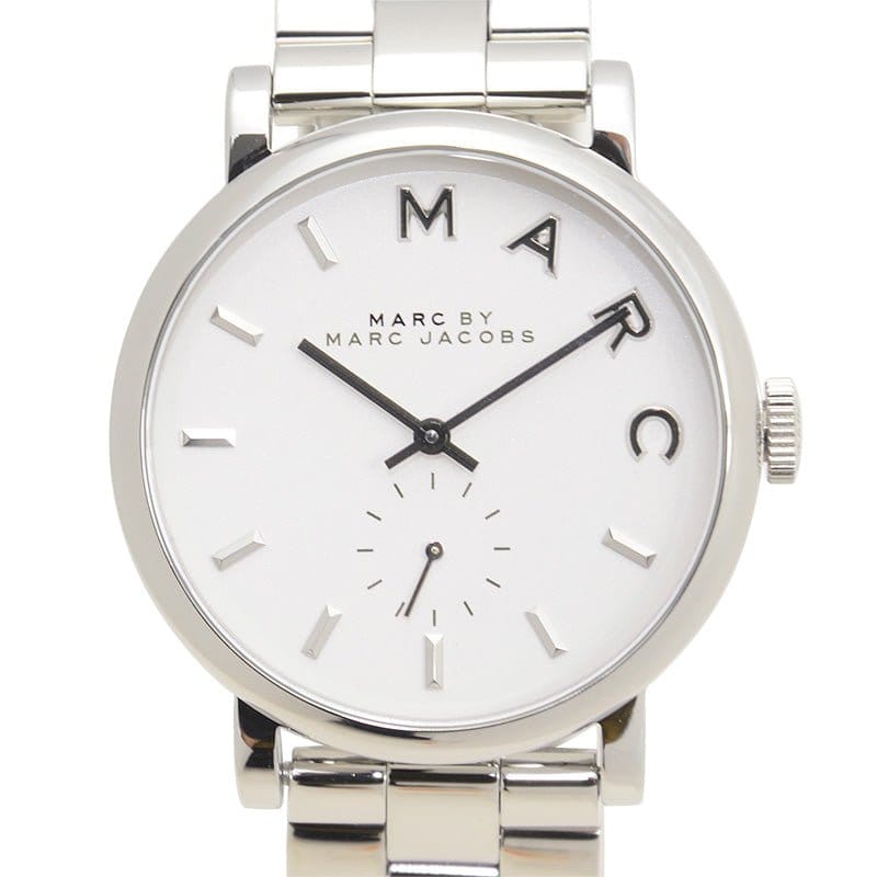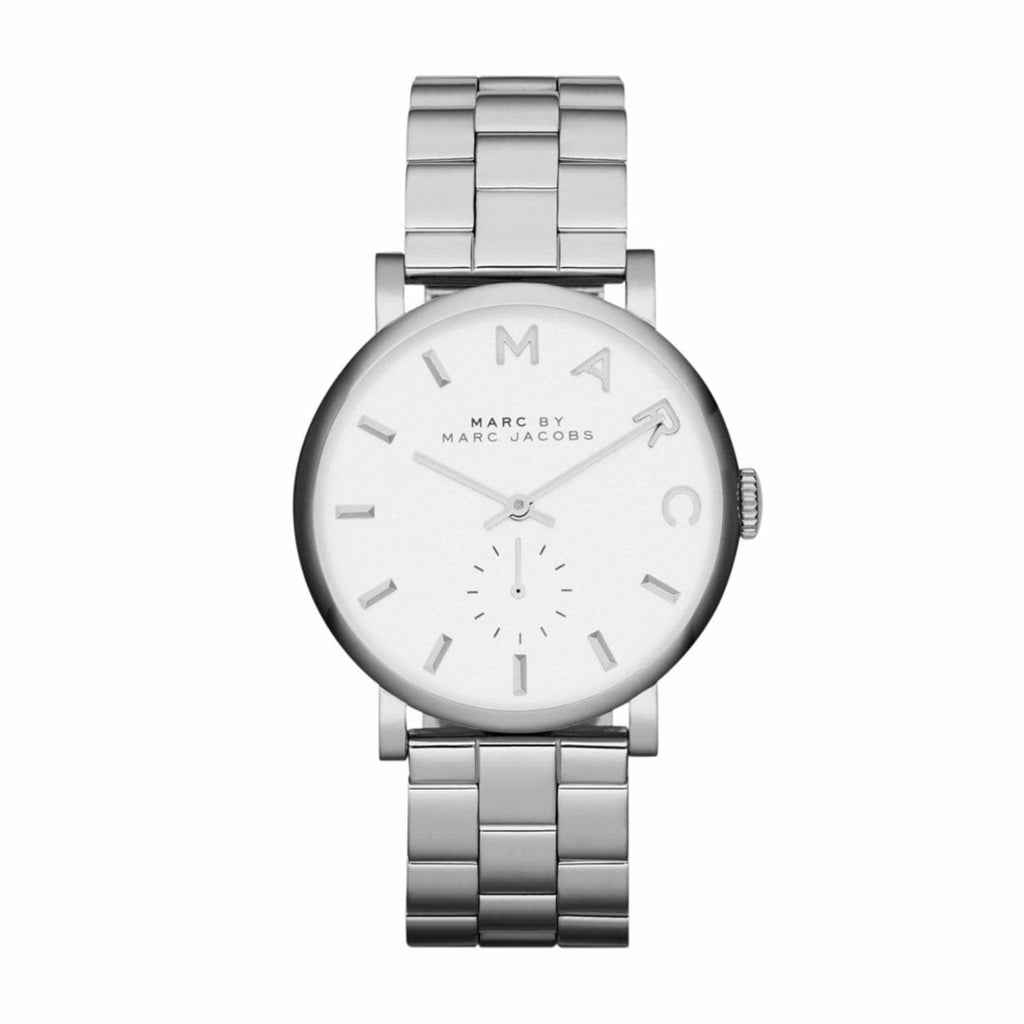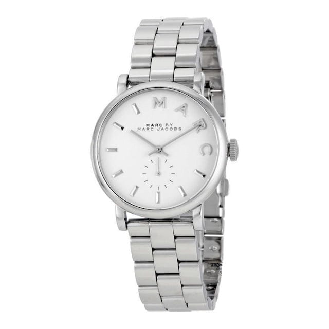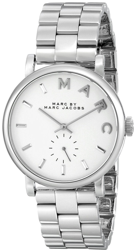 Chic women's watch from Marc by Marc Jacobs. Featuring a white pearlised dial with stainless steel iconic Marc lettering from the quarter hour on the dial. The round polished stainless steel case and bracelet with fastener complete the timeless design.Stainless steel case with a stainless steel bracelet. Fixed stainless steel bezel. White dial with silver-tone hands and index hour markers. Dial Type: Analog. Small seconds sub-dial above the 6 o'clock position. Quartz movement. Scratch resistant mineral crystal. Pull / push crown. Solid case back.