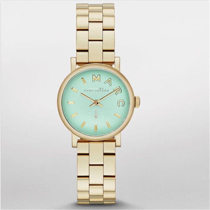 Marc Jacobs Baker Mbm3284 Green Womens’ Gold Wrist Watch MBM3284 has a 28mm gold plated case and a 12mm gold plated band.