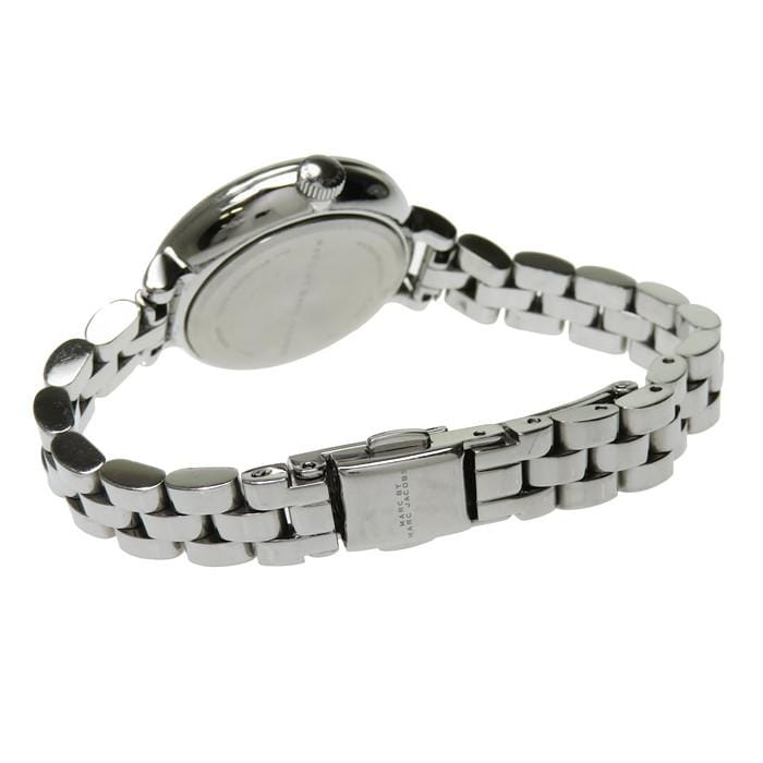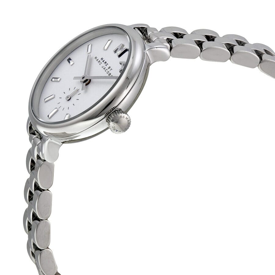 Stainless steel case with a stainless steel bracelet. Fixed stainless steel bezel. White dial with silver-tone hands and index hour markers. Dial Type: Analog. Seconds sub-dial above the 6 o'clock position. Quartz movement. Scratch resistant mineral crystal. Pull / push crown. Solid case back. Case size: 27 mm. Case thickness: 11 mm. Round case shape. Band width: 14 mm. Band length: 7 inches. Jewelry clasp. Water resistant at 50 meters / 165 feet. Functions: hour, minute, second. Casual watch style. Marc By Marc Jacobs White Dial Stainless Steel Ladies Watch MBM8642.| INFORMATION | |