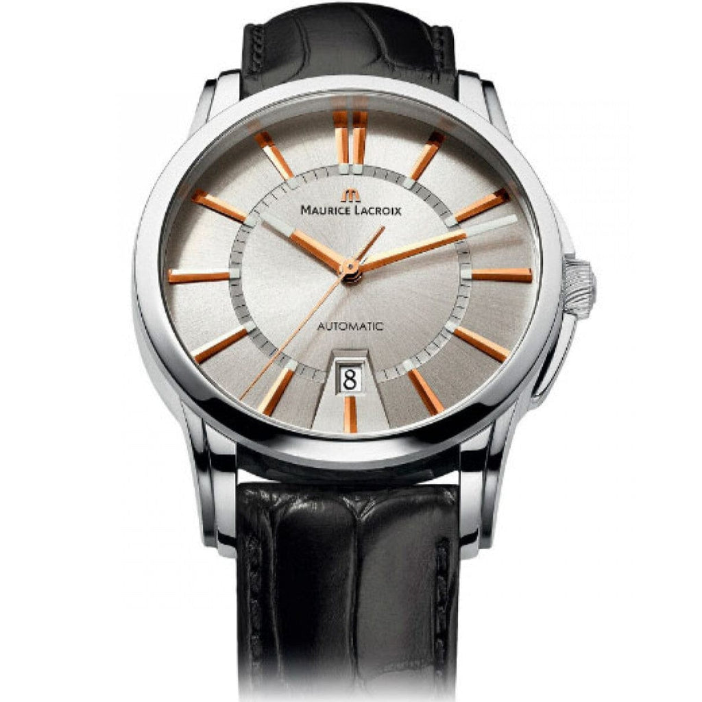 The Maurice Lacroix Pontos PT6148-SS001-131 men's watch combines elegance and Swiss quality. The stainless steel case is complemented by a stylish black leather strap (calfskin). The fixed stainless steel bezel frames the silver dial with luminous rose gold hands and index markers. The minute scale is located on the inner ring of the dial. The dial type is analog. The date window is conveniently located at the 6 o'clock position. The watch is equipped with an automatic Maurice Lacroix ML 115 movement with a power reserve of 38 hours.