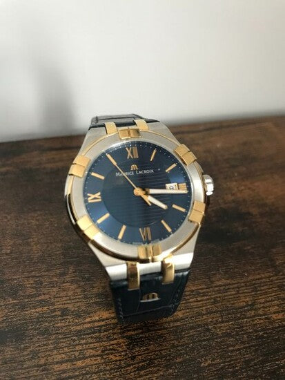 Swiss classic MAURICE LACROIX Aikon AI1008-PVY11-432-1 (AI1008PVY114321) men's watch. Quartz movement. The case is made of stainless steel partially covered with a gold-colored coating. Scratch-resistant sapphire glass. Navy blue leather strap. Diameter 42mm.