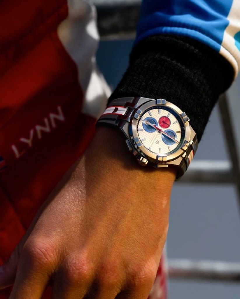 For the first time in a quartz version of an AIKON watch, the dial of the limited edition AIKON Chronograph Quartz Mahindra Racing features a square pattern. The chronograph is housed in a lightweight titanium case with a diameter of 44 mm and features a bright dial with three contrasting counters and a sunburst finish.