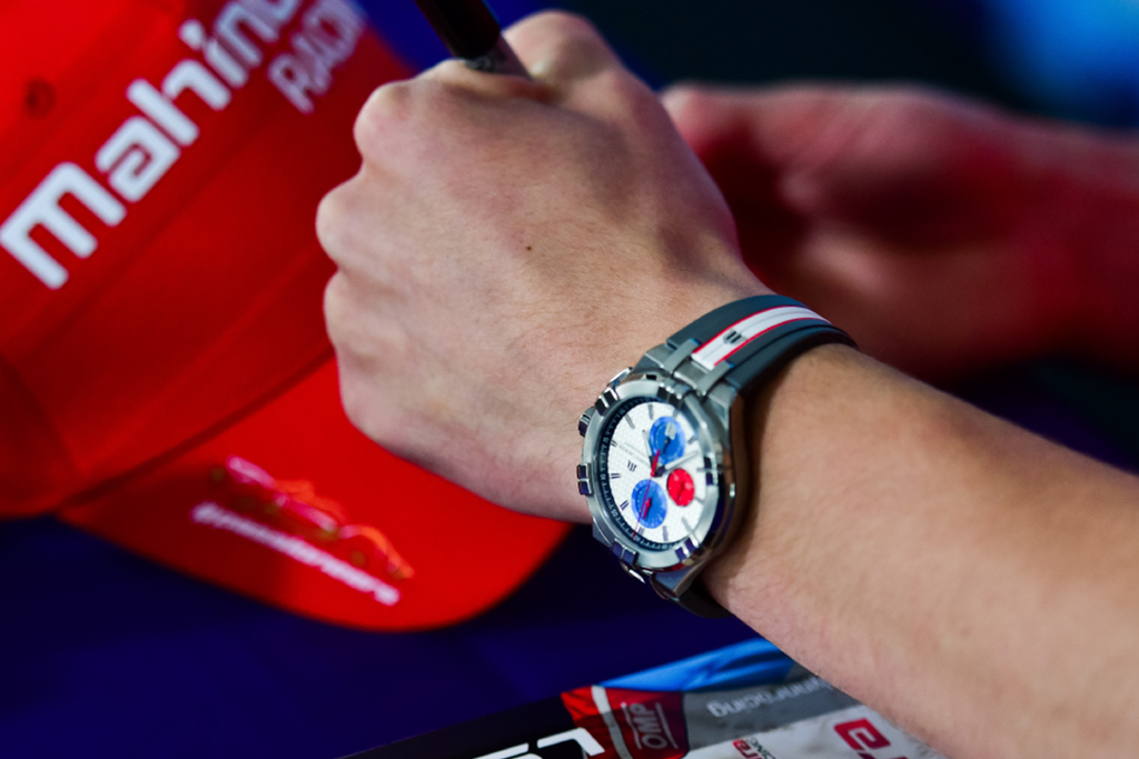 The small seconds indicator is located at 6 o'clock, the 1/10th of a second counter is at 12 o'clock. Both of these counters are blue, while the chronograph 30-minute counter at 9 o'clock is red. The gray minute scale around the dial makes it easy to read. The blue, red and gray colors are a nod to Mahindra's Formula E racing car. The model is complemented by a colored racing-inspired strap, and the case back can be seen engraved with the Mahindra team's racing jersey.