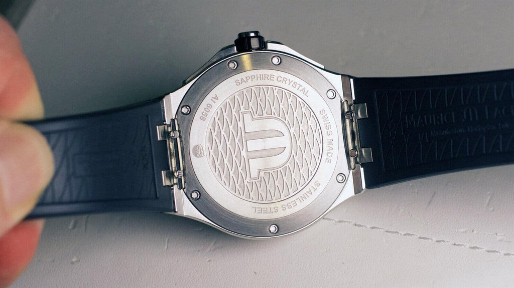 The movement is not visible from the closed caseback, as is expected of a watch with a water resistant rating of 300m. The stainless steel back is closed with 7 screws with special heads, and the back is embossed with the Maurice Lacroix logo within a wave motif.