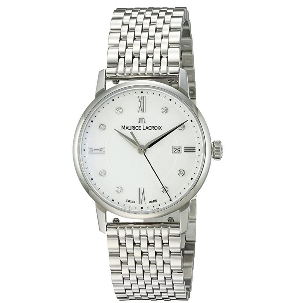 Maurice Lacroix Eliros Date Ladies 30 mm watch. Model reference: EL1094-SS002-150-1. Stainless steel case. White dial set with diamonds. Quartz movement. Stainless steel bracelet. This model also known as: EL1094.SS002.150.1, EL1094/SS002/150/1, EL1094SS0021501. Swiss made. Watch comes in original packaging, with set of documents and 2 years warranty
