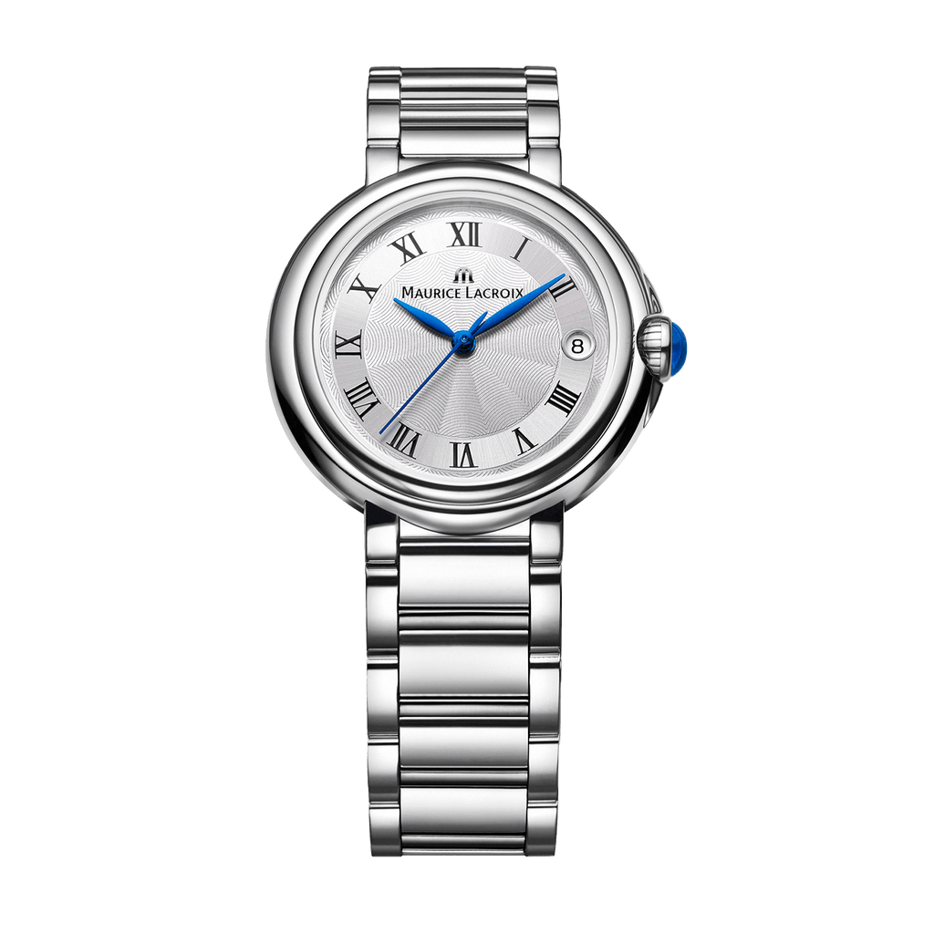 The women's Swiss Maurice Lacroix Fiaba Date FA1004-SS002-110-1 watch stands out for its elegant and precise design. It impresses with its guilloche dial and blue rhinestone in the crown. This elegant model will adorn every woman's wrist.