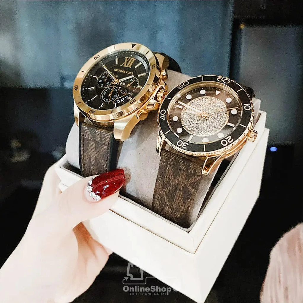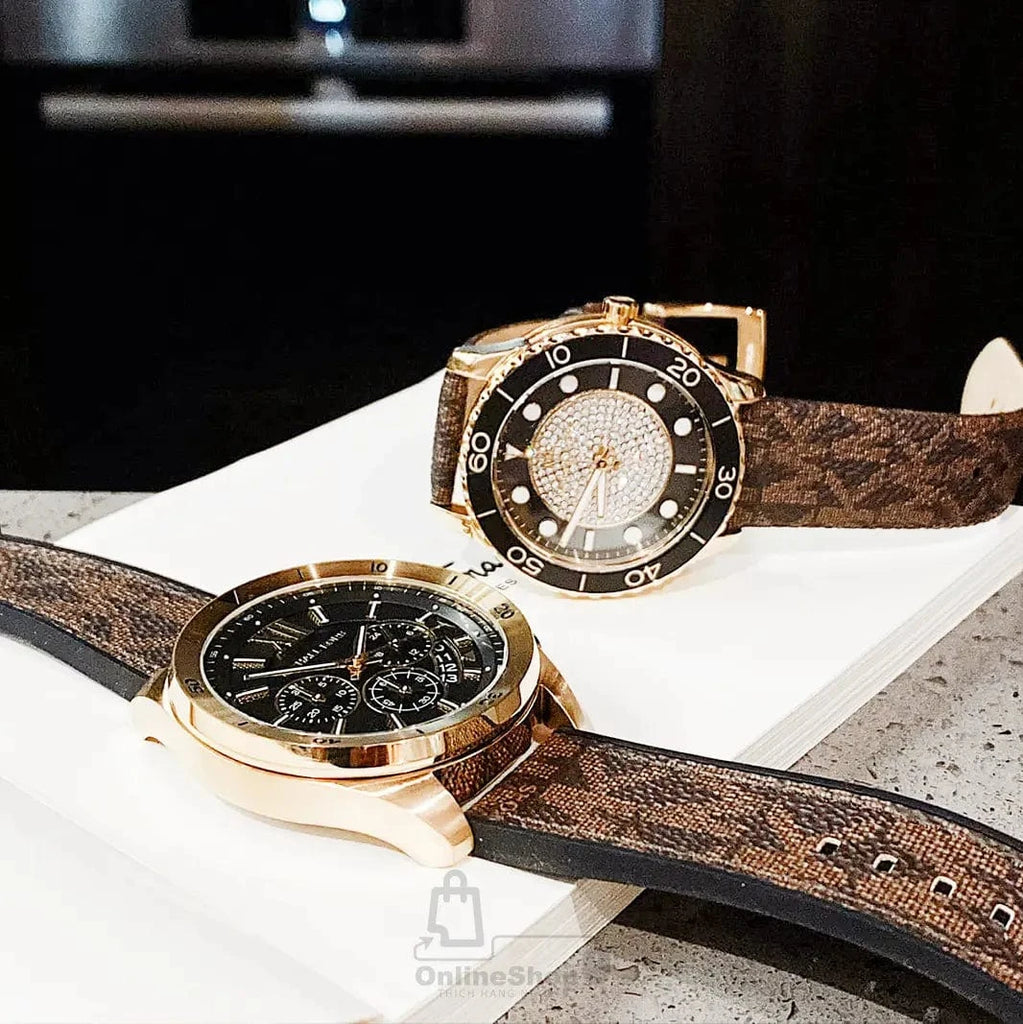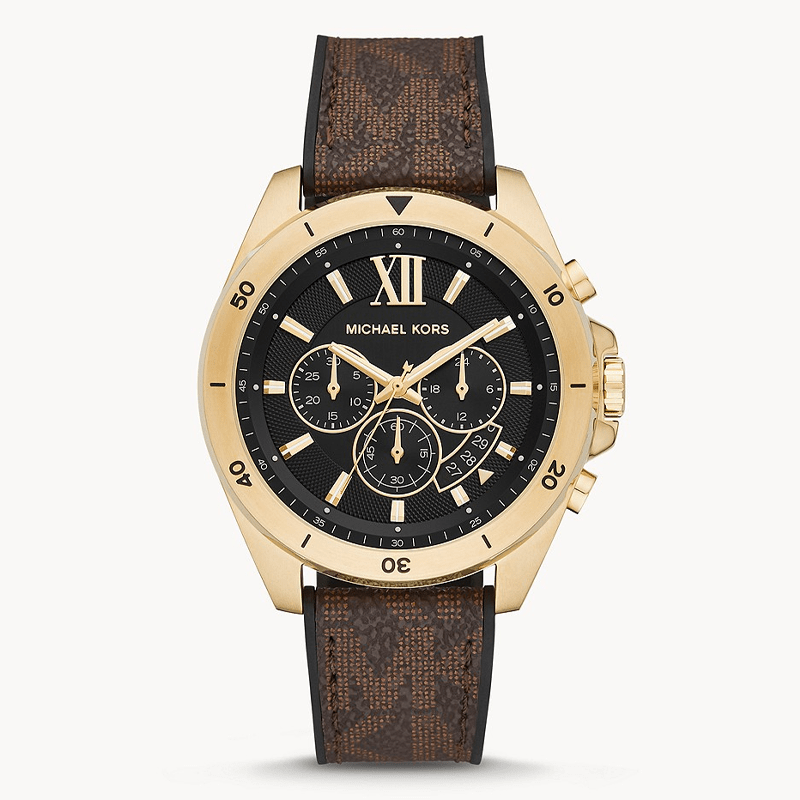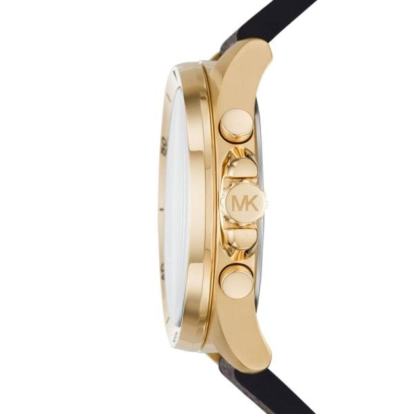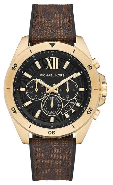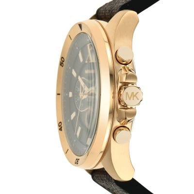 Black dial enhanced by luminous gold-tone hands. Gold-tone stainless steel case with a brown leather band. Quartz movement. 50 meters / 165 feet water resistance. Fixed bezel. Scratch Resistant Mineral crystal. Solid caseback. Tang clasp. Case size 45 mm x 11 mm. Band 22 mm x long. Michael Kors MK8849 Brecken Watch.