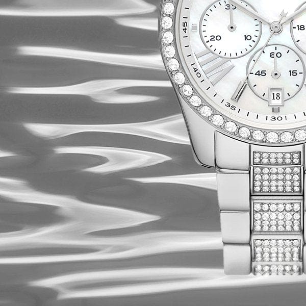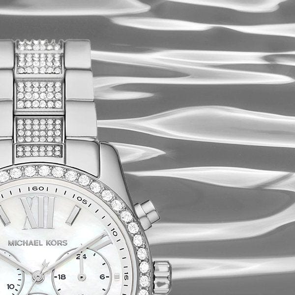 The dial colour is a stunning iridescent Mother-of-Pearl, which complements the pavé encrusted topring and centerlinks, adding a touch of glamour to this already striking timepiece. In addition to its stunning design, the Michael Kors MK7243 watch also features a date window and chronograph details, making it a truly dynamic timepiece.