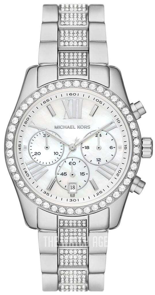 The watch is made of steel. Details: quartz movement, mother-of-pearl dial, mineral glass, water resistance 30WR, Roman numerals, indexes, bezel and bracelet inlaid with crystals, bracelet with folding clasp.The Michael Kors Lexington MK7243 is a watch designed for the woman who appreciates a touch of luxury in her everyday life. The 38mm white chronograph dial offers a clean, modern aesthetic with classic Roman numerals for easy readability. Crafted from sleek silver stainless steel and water-resistant up to 100 meters, this watch transitions flawlessly from work to weekend adventures. The reliable quartz movement ensures accurate timekeeping, making it a perfect companion for any occasion.