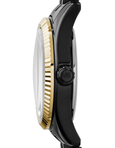 Scratch resistant mineral crystal. Pull / push crown. Solid case back. Case diameter: 26 mm. Case thickness: 8.5 mm. Round case shape. Band width: 12.5 mm. Deployment with push button release clasp. Water resistant at 50 meters / 165 feet. Functions: hour, minute, second. Casual watch style. Michael Kors Lexington Black Dial Black Ion-plated Ladies Watch MK3299.