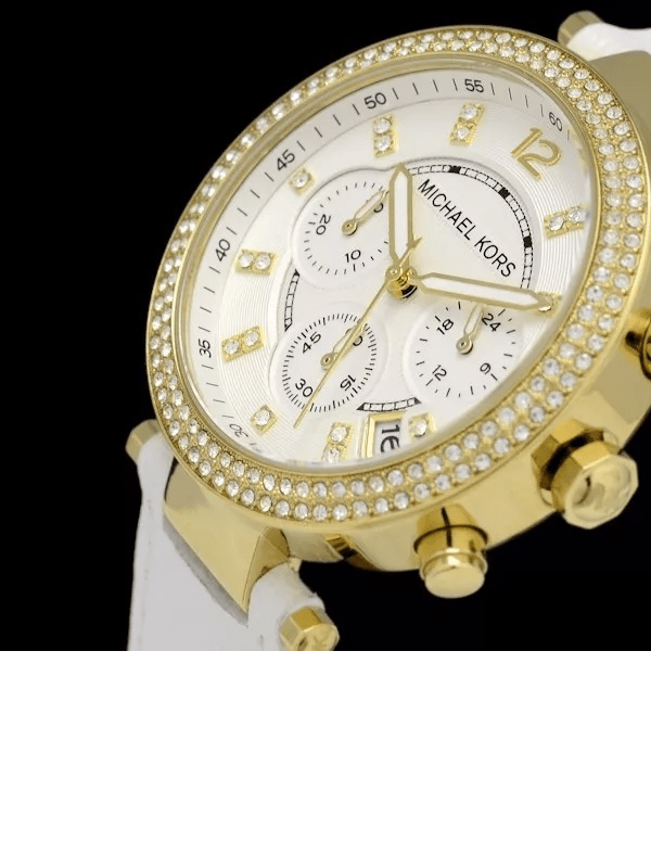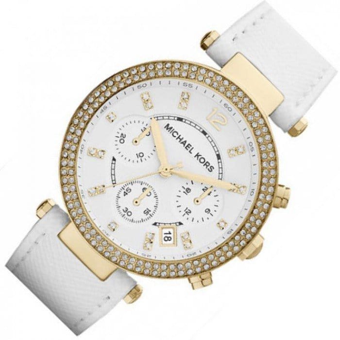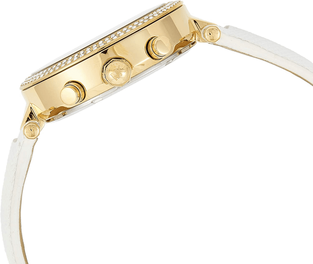 This Michael Kors Parker Chronograph Gold-tone Dial Ladies Watch MK2290 comes in yellow gold-tone stainless steel case with a white leather strap. Fixed yellow gold-tone bezel set with crystals. White dial with yellow gold-tone hands and crystal index hour markers. Arabic numeral marks the 12 o'clock position. Minute markers around the outer rim. Dial Type: Analog. Luminescent hands.
